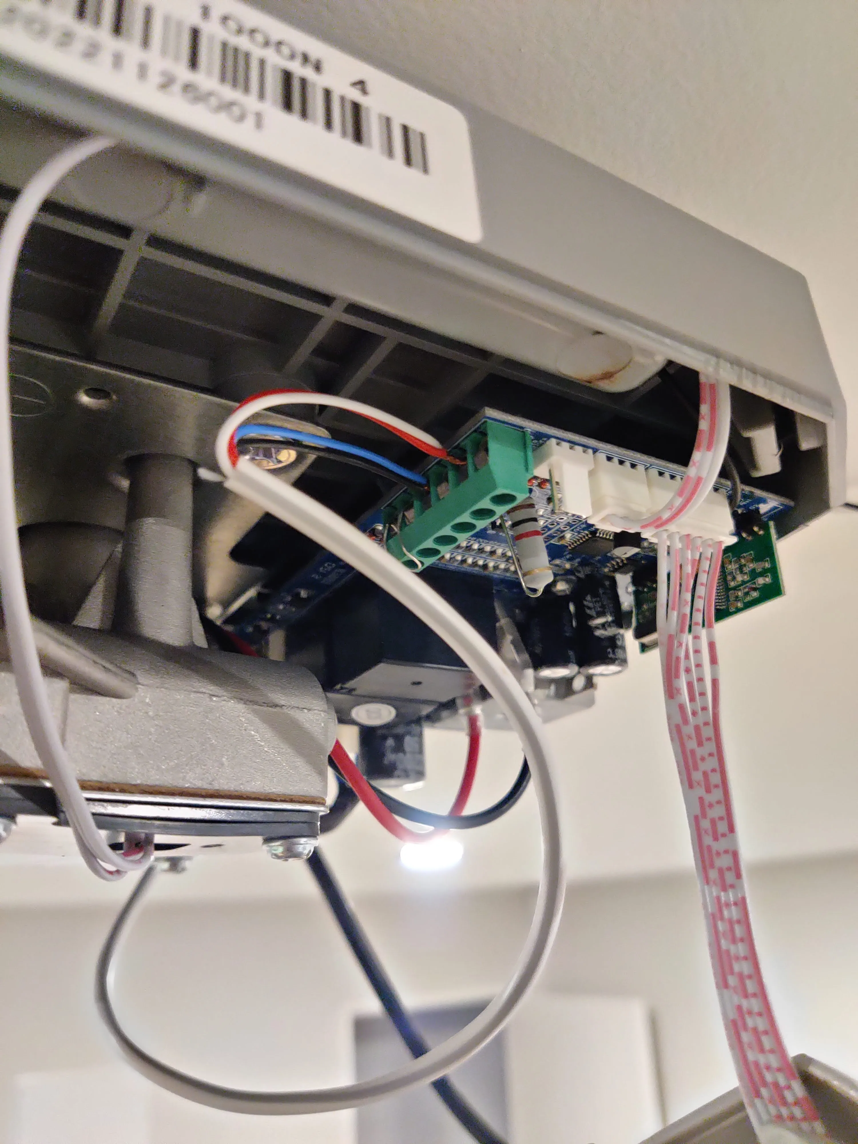 I was a little concerned before taking off the GDO cover that I would be having to drill some holes for the wires, but handily the base plate of the unit had some premade holes wide enough for the cables. I made sure to unplug everything (safety first) and slotted the 12v leads through the first hole. I attached the leads to the Plus 1 just like I did on the exploded view on the carpet. I had to let it dangle at this point, but the wires and the attachment seemed solid.